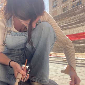 Mi proceso comienza en la calle. Vivir en el presente conectada al entorno constantemente es incómodo, agotador. Camino desconectada, cansada por la exigencia de estar presente, hasta que un detalle —una baldosa centenaria, una placa conmemorativa, una textura erosionada— detiene mi andar. Allí donde piso encuentro historias que nadie cuenta, símbolos que repetimos sin saber por qué, marcas que habitamos sin mirarlas. Y en ese gesto mínimo de inclinarme a calcar un piso con arcilla, acepto habitar la incomodidad: exponerme, ensuciarme, hacer visible mi presencia en el espacio público y atravesar esa frontera de lo pasivo a lo activo.
